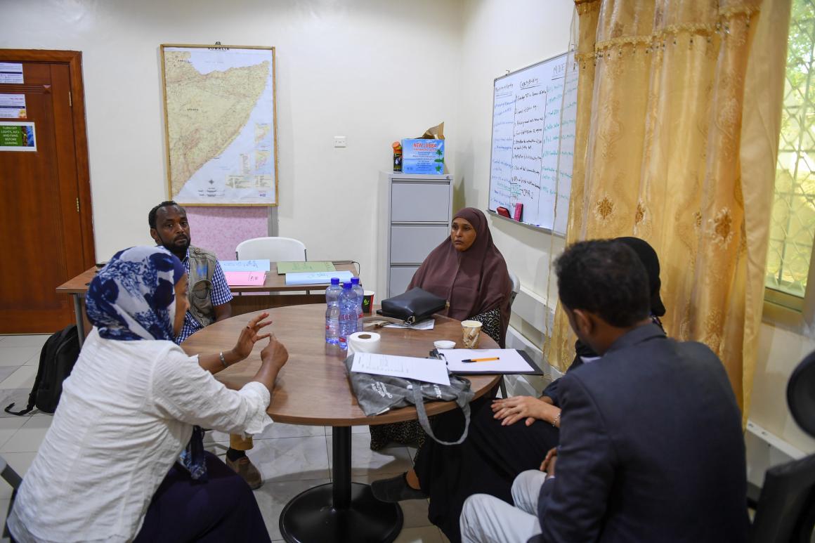 Shown here, Ms. Abuagla starts outlining the plan for the day to the team, which includes colleagues flown up from Mogadishu to bolster local efforts.