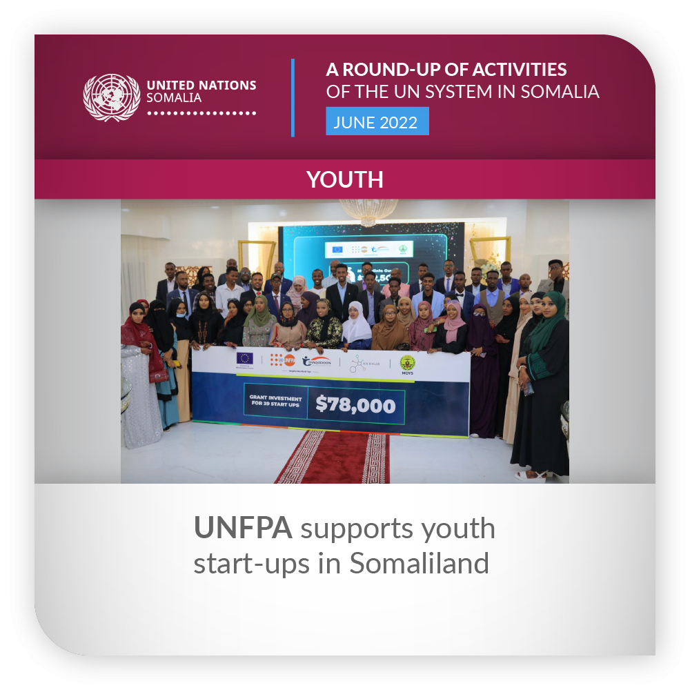 Under the EU-funded project Accelerated Socio-Economic Empowerment of Youth, UNFPA and the Somaliland Ministry of Youth and Sports held an awards ceremony on 23 June. The EU Youth Fund supports youth with start-up grants after completing ideation boot camps and undergoing extensive mentorship and coaching. This ultimately helps them in shaping their ideas into successful ventures. Grant recipients have so far included 39 start-up ventures, two social-enterprise institutions and three awareness groups. The Youth Fund targets youth start-ups that otherwise would not qualify for loans from credit facilities.