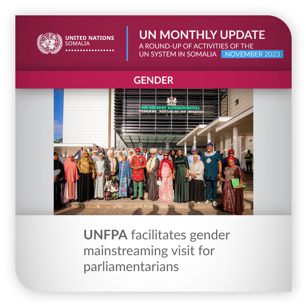 ![]() | Gender | UNFPA facilitates gender mainstreaming visit for parliamentarians UNFPA facilitated a study tour to Nigeria of a delegation of 14 female Somali parliamentarians, selected from the country’s House of the People and Senate. The visit offered delegates an opportunity to engage in dialogue and learn from the experience of Nigerian parliamentarians. It aimed to enhance the capacity of Somali MPs in initiating and sponsoring gender-sensitive legislation, specifically addressing gender-based violence and harmful traditional practices. The study tour included high-level meetings with leaders of Nigeria’s upper and lower houses of parliament, laying the foundation for future collaboration and fostering gender mainstreaming and good governance. | |