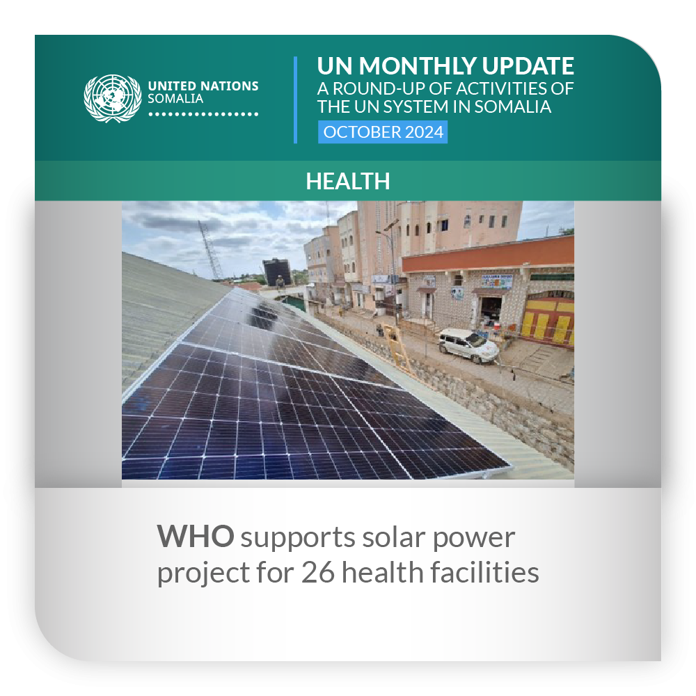 ![]() | Health | WHO supports solar power project for 26 health facilities A project supported by the Kingdom of Saudi Arabia and WHO came to a conclusion recently, ending with major enhancements in more than two dozen health facilities across Somalia. The ‘Every Breath Counts’ project aimed to improve health service delivery for children suffering from pneumonia and diarrhoea – the two biggest health threats faced by Somali children. With a financial contribution of $2 million from the King Salman Humanitarian Aid and Relief Centre, the project solarized 26 health facilities, including 17 maternal and child health centres and nine referral hospitals. The centres are fully solarized, meeting all their power needs from solar, while the referral hospitals use solar power primarily to ensure a constant oxygen supply for critically ill patients. According to WHO, the initiative not only addressed the significant lack of reliable electricity in health facilities but also improved maternal and child health outcomes, advancing universal health coverage in Somalia. | |